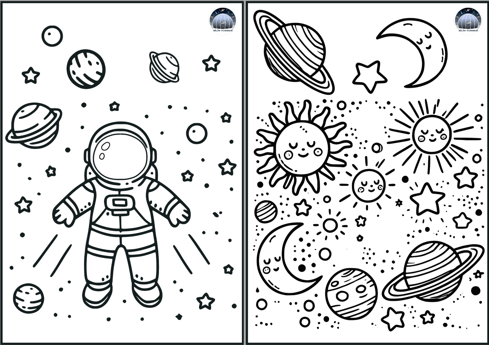 Bilim temalı çizimler: Astronotlar, gezegenler, uzay araçları ve daha fazlası.